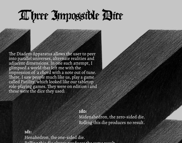 The Diadem Apparatus allows the user to peer into parallel universes, alternate realities and adjacent dimensions. In one such attempt, I glimpsed a world that left me with the impression of a chord with a note out of tune. There, I saw people much like us, play a game called Futility, which looked like our tabletop role-playing games. They were on edition i and these were the dice they used: